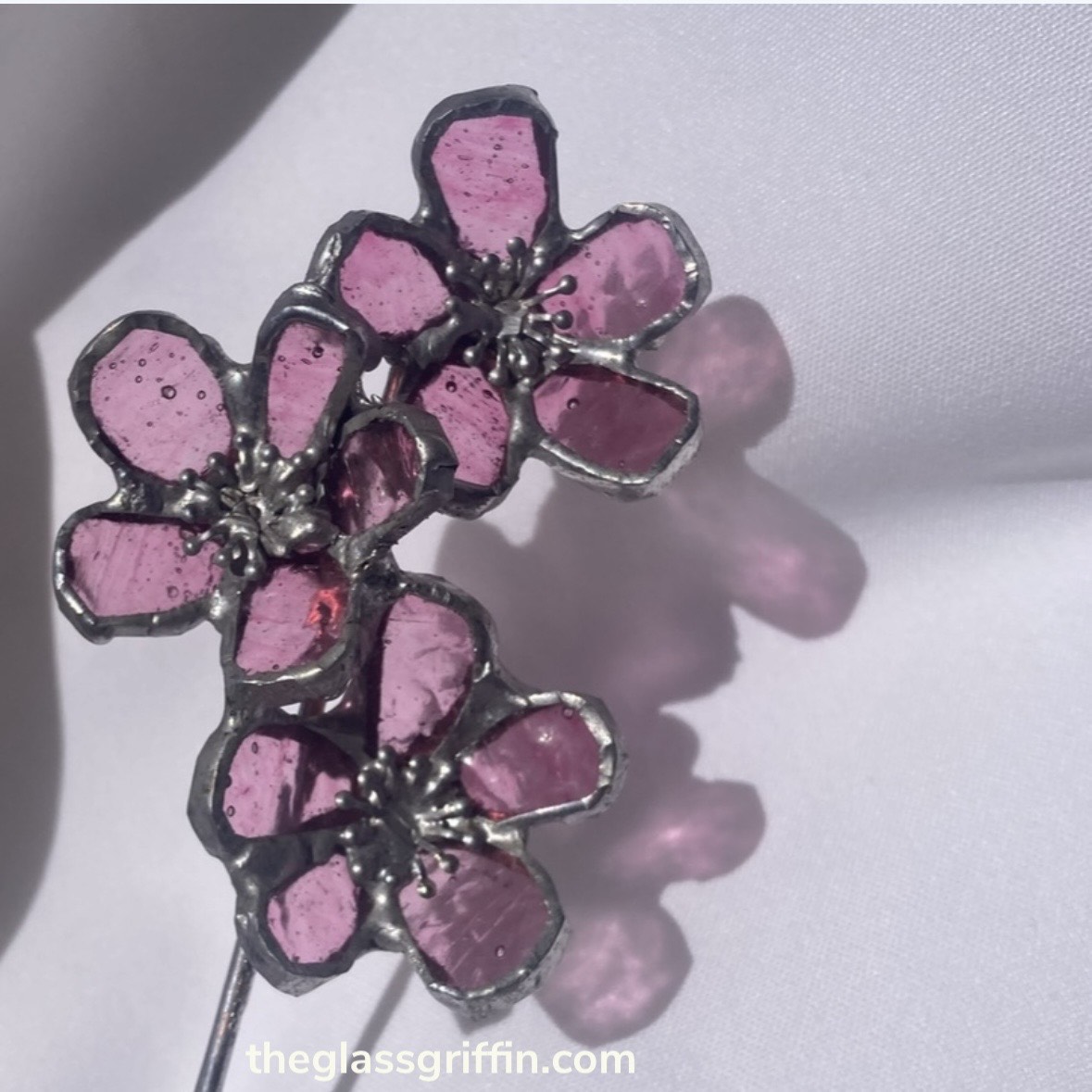 12 inch stem with 3 pink stained glass cherry blossoms.